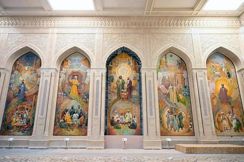 Mit dem Saal der Ersten Renaissance machen die Gäste Bahrom Abduxalimov, Vizepräsident der Akademie der Wissenschaften Usbekistans und Direktor des Instituts für Orientalistik, Rustam Djabbarov, wissenschaftlicher Sekretär des Zentrums für Islamische Zivilisation, und Elena Ivanovich, General Managerin und Leiterin für Strategische Entwicklung bei Magister Art, vertraut.