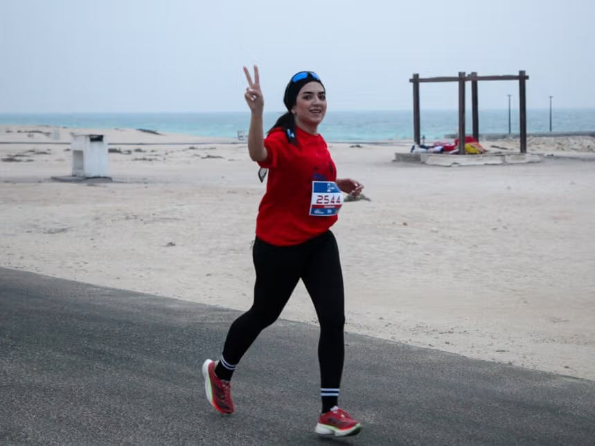 Junge Frau beim Marathonlauf auf der iranischen Insel Kisch im Persischen Golf, 5. Dezember 2025. Foto: iranintl.com